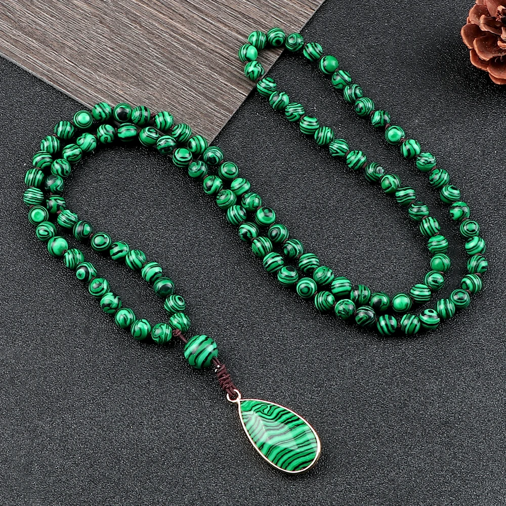 108 Mala Beads Necklaces Fashion Stone Drop Pendant Green Malachite Handmade Knotted Necklace for Women Men Prayer Neck Jewelry Friendship Gift