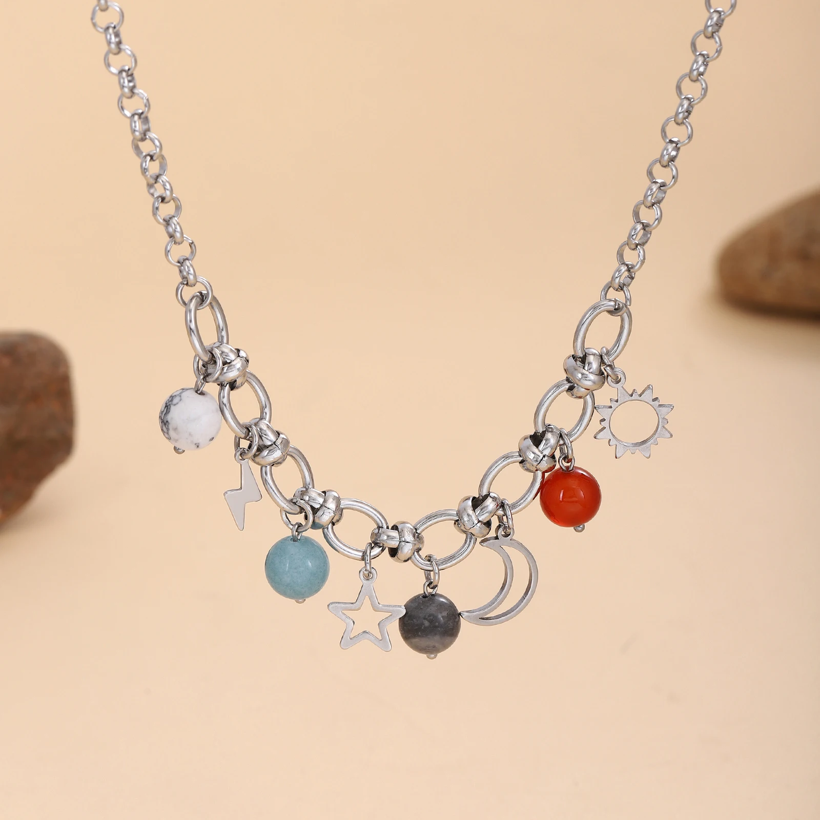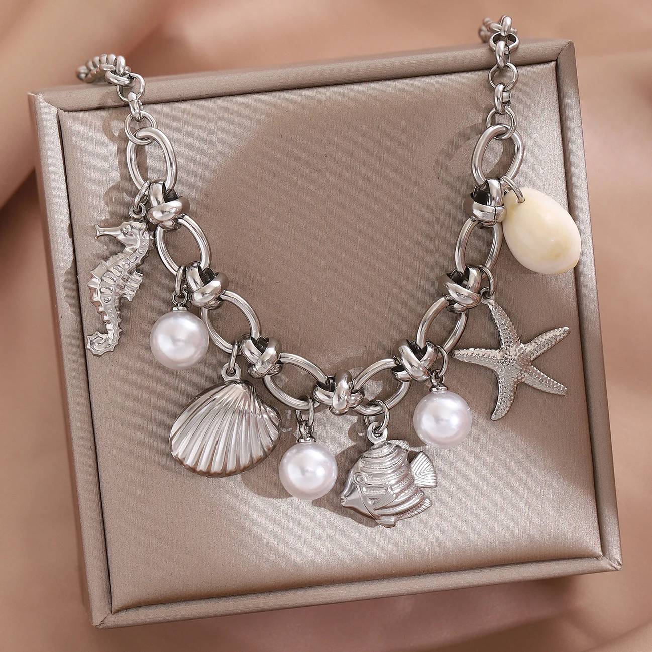 - Collier en acier inoxydable avec pendentifs étoile de mer et conque.